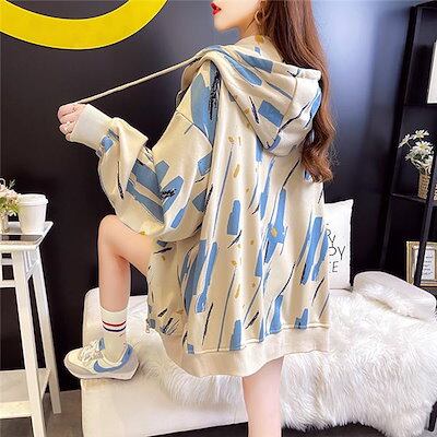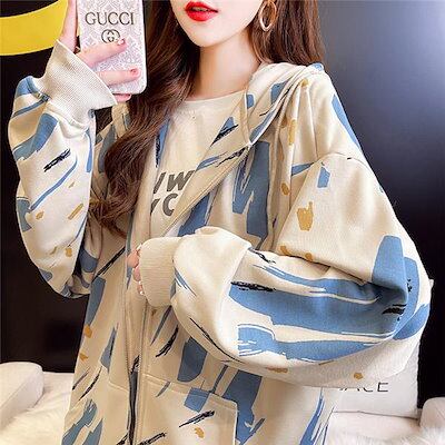 秋新作 パーカー ジャケット レディース 柄 長袖ジップアップ パーカー チュニック ゆったり 体型カバー カジュアル アウター