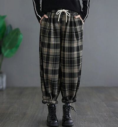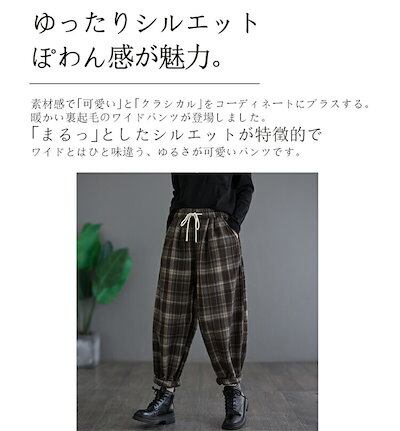裏起毛 パンツ レディース あったか 防寒 チェッ柄 バルーンパンツ 秋冬 暖かい ロングパンツ 長ズボン ゆったり 体型カバー 着痩せ チェック柄パンツ ボトムス サルエルパンツ 裏ボア 寒さ対策 | HUG-L