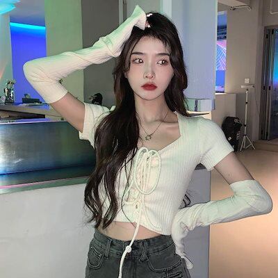 純欲風 ギャル Tシャツ韓系トップス スリミング 着痩せ 半袖ニット レディース夏 ショート丈 ブラウス