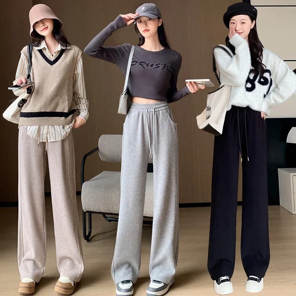 女性用の厚手のフリース裏地付きベルボトム、カジュアルなストレートレッグパンツ、ハイウエストのドレープレスケーキパンツ、新モデル、冬 ボトム ワイドレッグ バギーパンツ T240901094848_02 | HUG-L