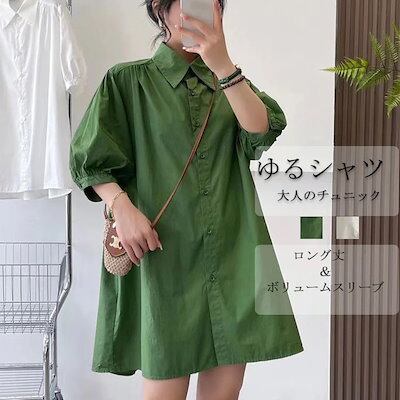 チュニック 半袖 夏 ロングシャツ レディース 羽織 薄手 シャツ 前開き パフ袖 ブラウス トップス 半袖シャツ シャツブラウス ロング丈 春 無地 大きいサイズ 40代 ゆったり 前開け 体型カ | HUG-L