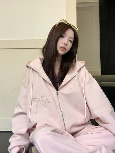 2024 秋冬 韓国 3点セット かわいい レディース フード付きアウター_白フーディー ブルゾン長袖ショート丈トップスグレー冬カジュアルファッション系お出かけフル丈トラック高校生 通学大学生 | HUG-L