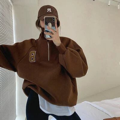 2024 秋冬 2TYPE 裹起毛トップス長袖かわいいプリントK-POPTロングレディース韓国風衣装カラールーズゆったりカジュアルハーフおしゃれサイズスリーブシルエットファッション系サイドシャツグレー | HUG-L