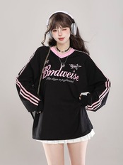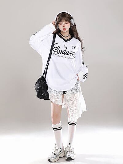 2024 秋冬 トレンドVネックトップスバイカラー長袖 かわいいK-POPTロング_白レディース韓国風ロゴ衣装ルーズゆったりカジュアルおしゃれサイズスリーブシルエットファッション系サイドシャツフット春 | HUG-L
