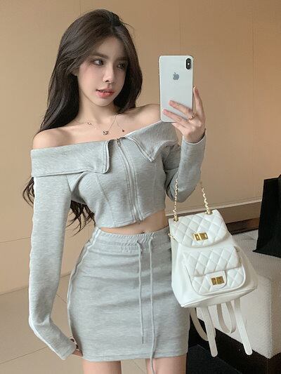 2024 秋冬 2点セット 2wayトップス スカート長袖 かわいいラウンドネックTシャツレディース韓国風ルーズゆったり無地 カジュアルサイズおしゃれファッション系サイドフルパーカーお出かけダブル | HUG-L