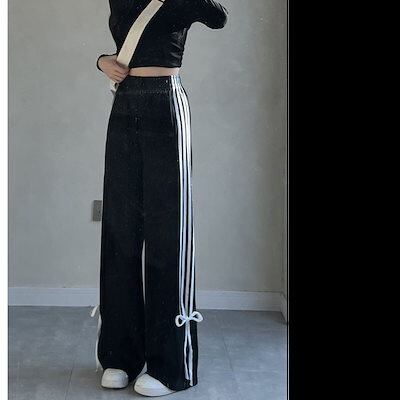 2024秋冬 パンツロング丈ストレート ストライプウエストゴム ハイウエストゆったり 脚長効果美脚効果細見え春カジュアル 黒韓国系ファッションレディースサイドお出かけおしゃれ かわいい衣装 トラック | HUG-L