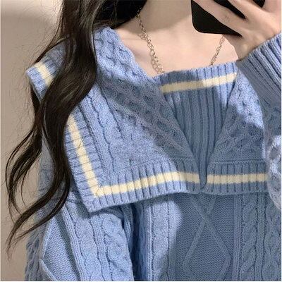 韓国系甘くてかわいいネイビーカラーの優しいカレッジ風ニットトップス秋冬厚手ゆったりセーターレディース